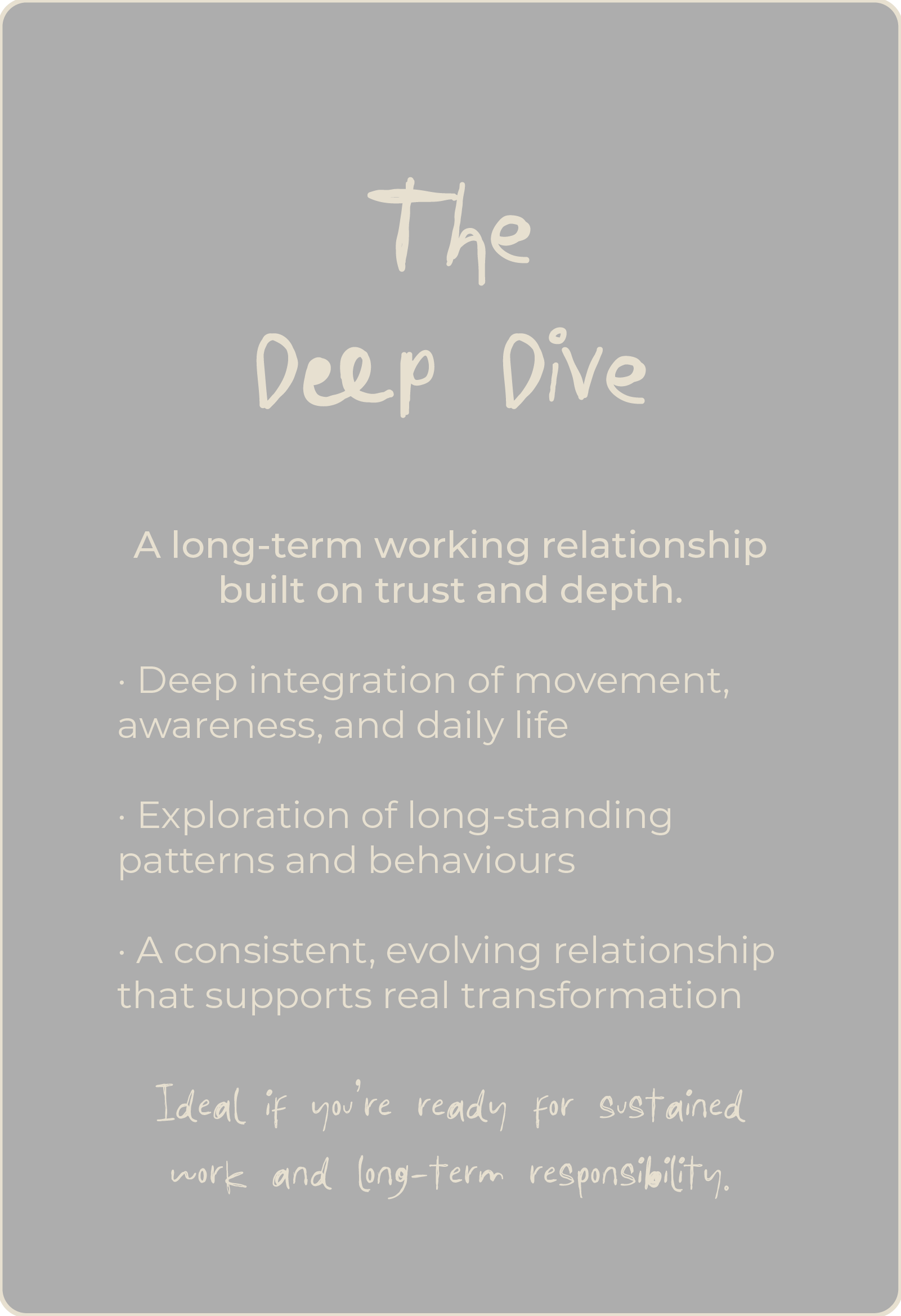 Sessions are living conversations - practical, embodied, and responsive - designed to support real change in how you move, relate, and live.